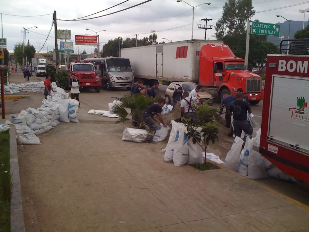En la avenida José López Portillo, bomberos de Tultitlán colocaron costales de arena en las calles principales del conjunto habitacional COCEM, en prevención para que el agua no se meta las casas.